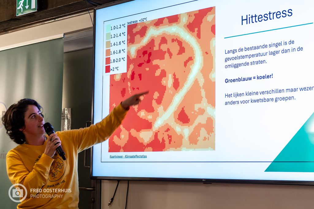 Agnes Hermans, bijna afgestudeerd bioloog en klimaatonderzoeker met een specialisatie in Environmental Policy, presenteerde een helder betoog over de meerwaarde van groen en blauw, in het bijzonder over het hergraven van de Westbuitensingel. Haar conclusie: vergroening en ‘verblauwing’ zijn onmisbaar voor mens, klimaat en biodiversiteit én kansrijk in uitvoering.