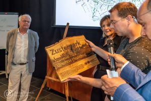 Een symbolisch moment: de overhandiging van het Zusterparkbord door Jeroen Heemsbergen van Nationaal Park Utrechtse Heuvelrug. Het toekomstige stadspark wordt daarmee onderdeel van het bredere idee van ‘samen één park’: groene gebieden die ecologisch én in beleving met elkaar verbonden zijn.